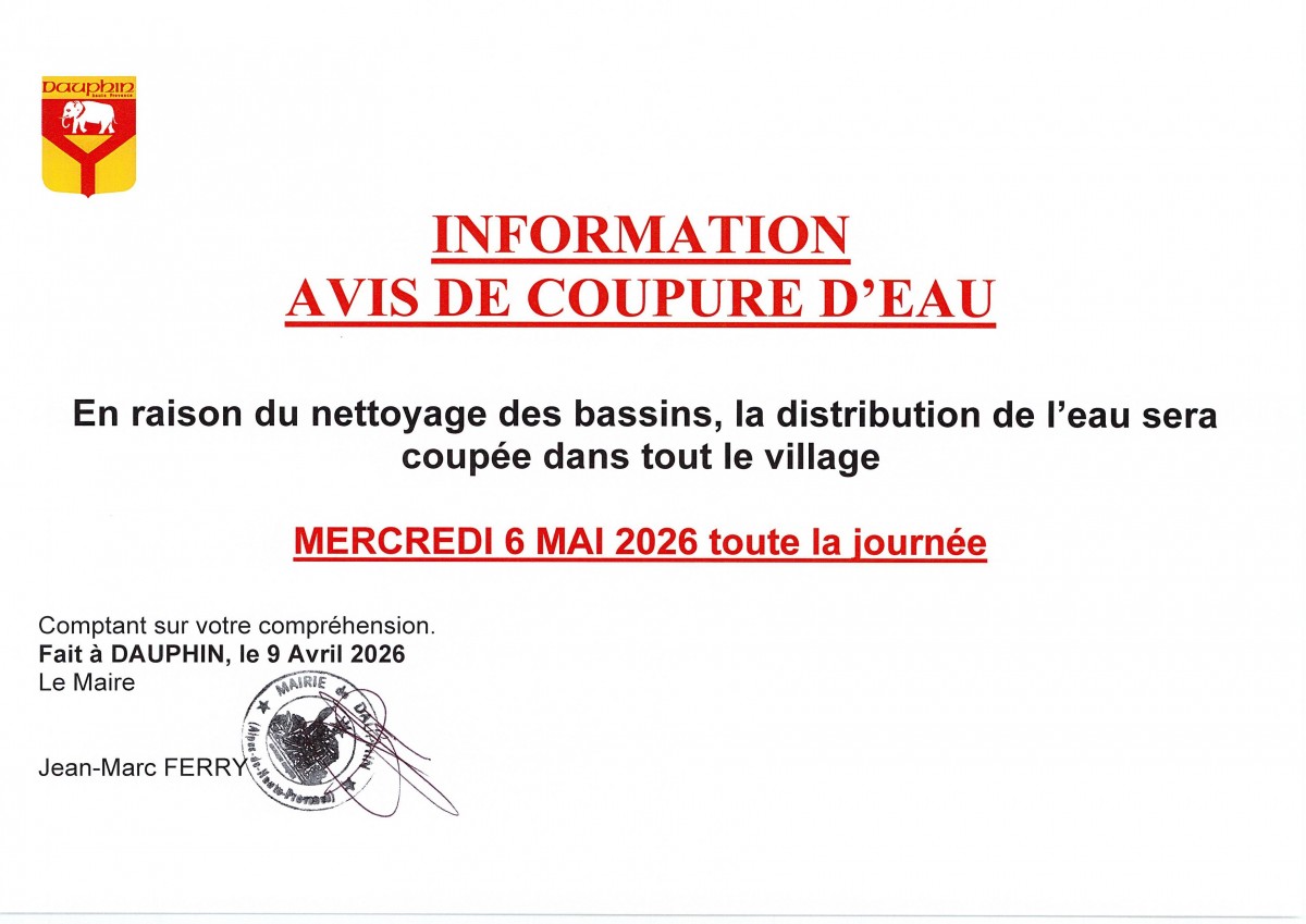 COUPURE D'EAU TOUTE LA JOURNEE LE MERCREDI 6 MAI 2026 EN RAISON DU NETTOYAGE DES BASSINS