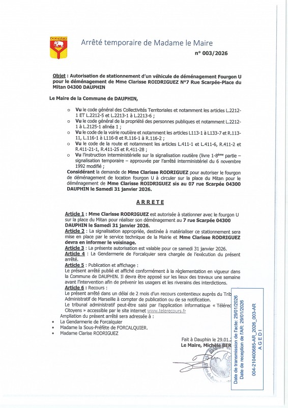 ARRETE TEMPORAIRE DEMENAGEMENT PLACE MITAN