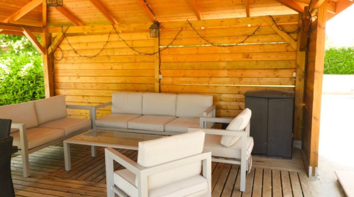 une terrasse couverte avec mobilier de détente et chaises longues.